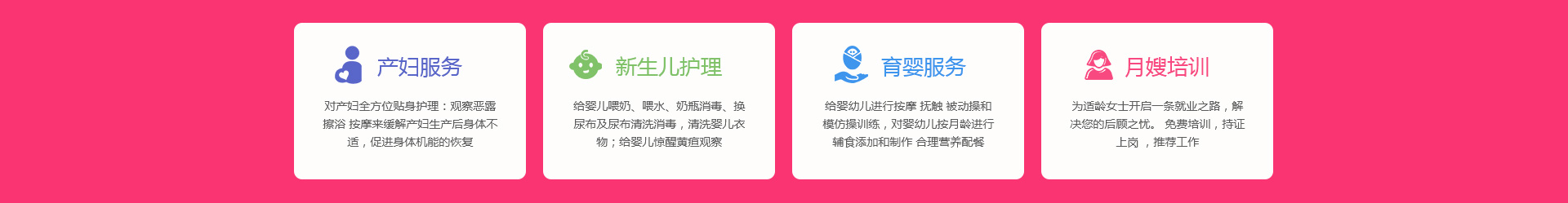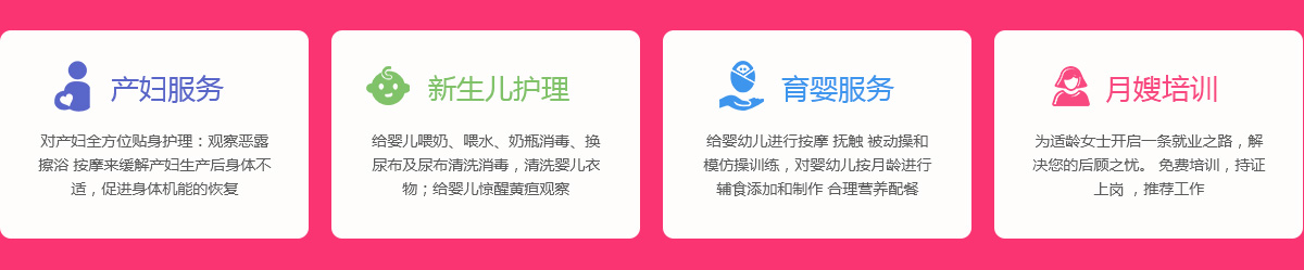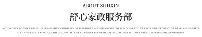 關(guān)于我們 產(chǎn)婦服務(wù) 新生兒護(hù)理 育嬰服務(wù) 月嫂培訓(xùn) 催乳師培訓(xùn) 舒心家政 月子餐 資質(zhì)榮譽 服務(wù)案例
